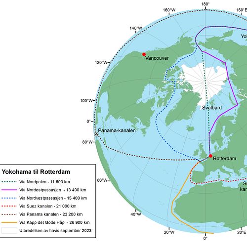 Utbredelse av is i Polhavet i september 2023, rutealternativ og omtrentlige seilingsdistanser mellom Yokohama i Japan og Rotterdam i Holland (Illustrasjon Chris Emblow, Akvaplan-niva).