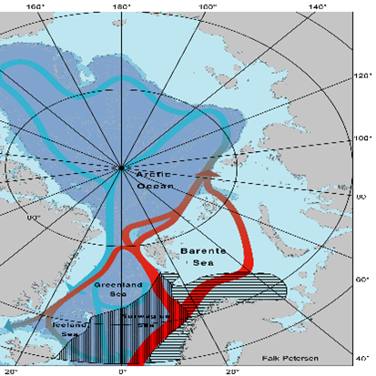 Nansens Fram-ekspedisjon, som utnyttet den transpolar isdriften over Polhavet, sammen med senere studier av Helland-Hansen og Nansen av strømsystemet i Norskehavet (1900-1905), avdekket at strømmene i Polhavet og Norskehavet til sammen utgjør et sammenhengene transportsystem. Dette systemet frakter enorme vannmasser, sedimenter, is, energi (varme), planteplankton, dyreplankton, isamfipoder, fiskelarver og småfisk mellom Polhavet og Norskehavet.