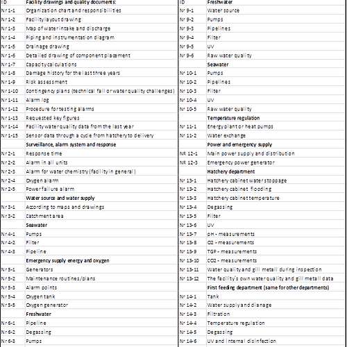 This study is based on 21 risk assessments of different land-based aquaculture facilities in Norway, including 18 smolt and post-smolt facilities for Atlantic salmon (Salmo salar), one salmon hatchery, one smolt facility for rainbow trout (Oncorhynchus mykiss) and one juvenile facility for lumpfish (Cyclopterus lumpus).