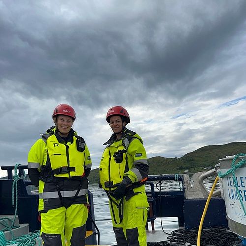 Fiskehelsebiolog Elise Rønningen og seniorforsker Lauris Boissonnot fra Akvaplan-niva på prøveuttak på FoU-lokalitet (Foto: Akvaplan-niva).
